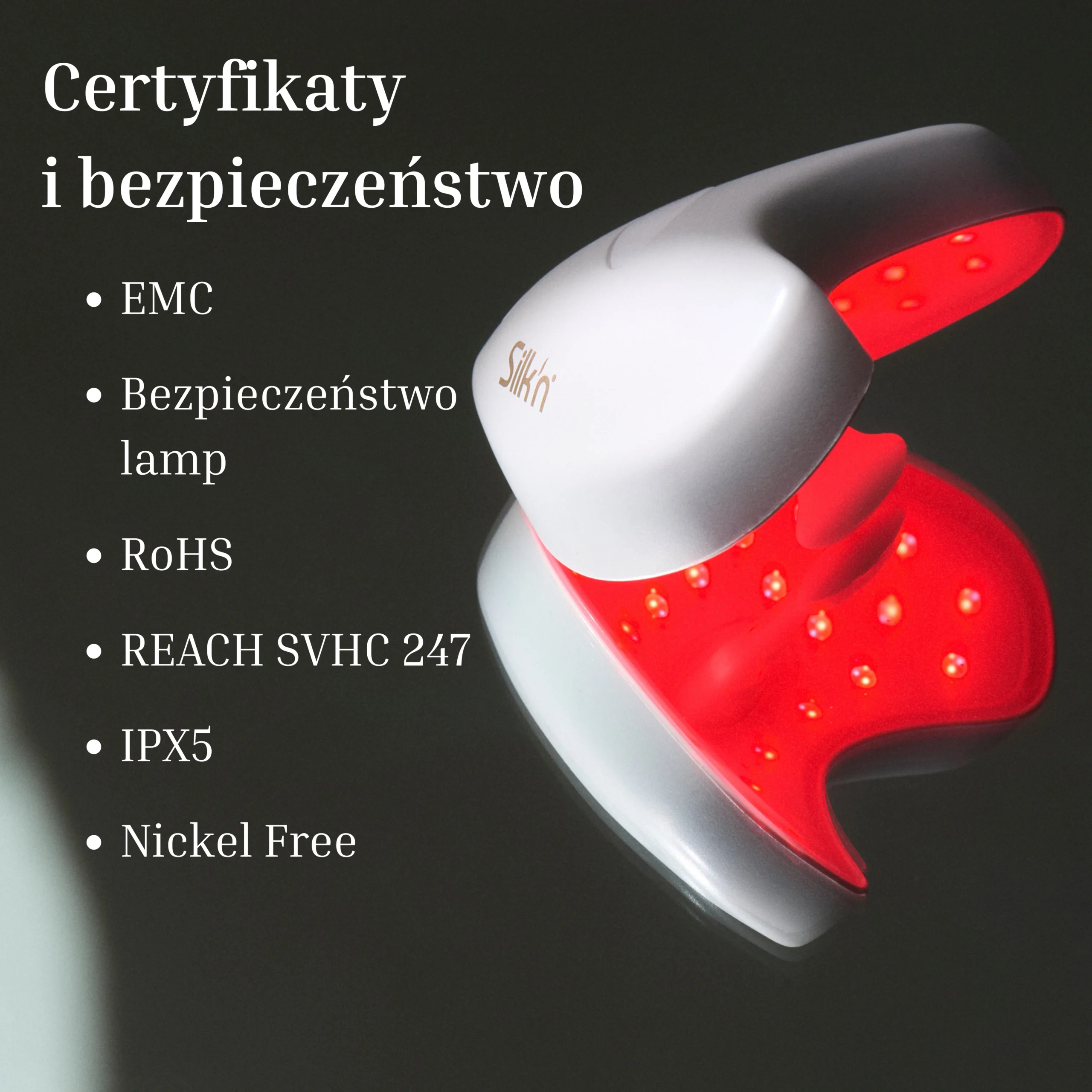 Tak. Maska LumiLips jest bezpieczna w codziennym użytkowaniu i posiada certyfikaty potwierdzające jej jakość oraz zgodność z normami. Spełnia wymagania EMC, Safety of Lamps and Lamp Systems, RoHS i REACH SVHC, jest odporna na zachlapania (IPX5) oraz bezpieczna dla skóry, także wrażliwej (normy dotyczące niklu).