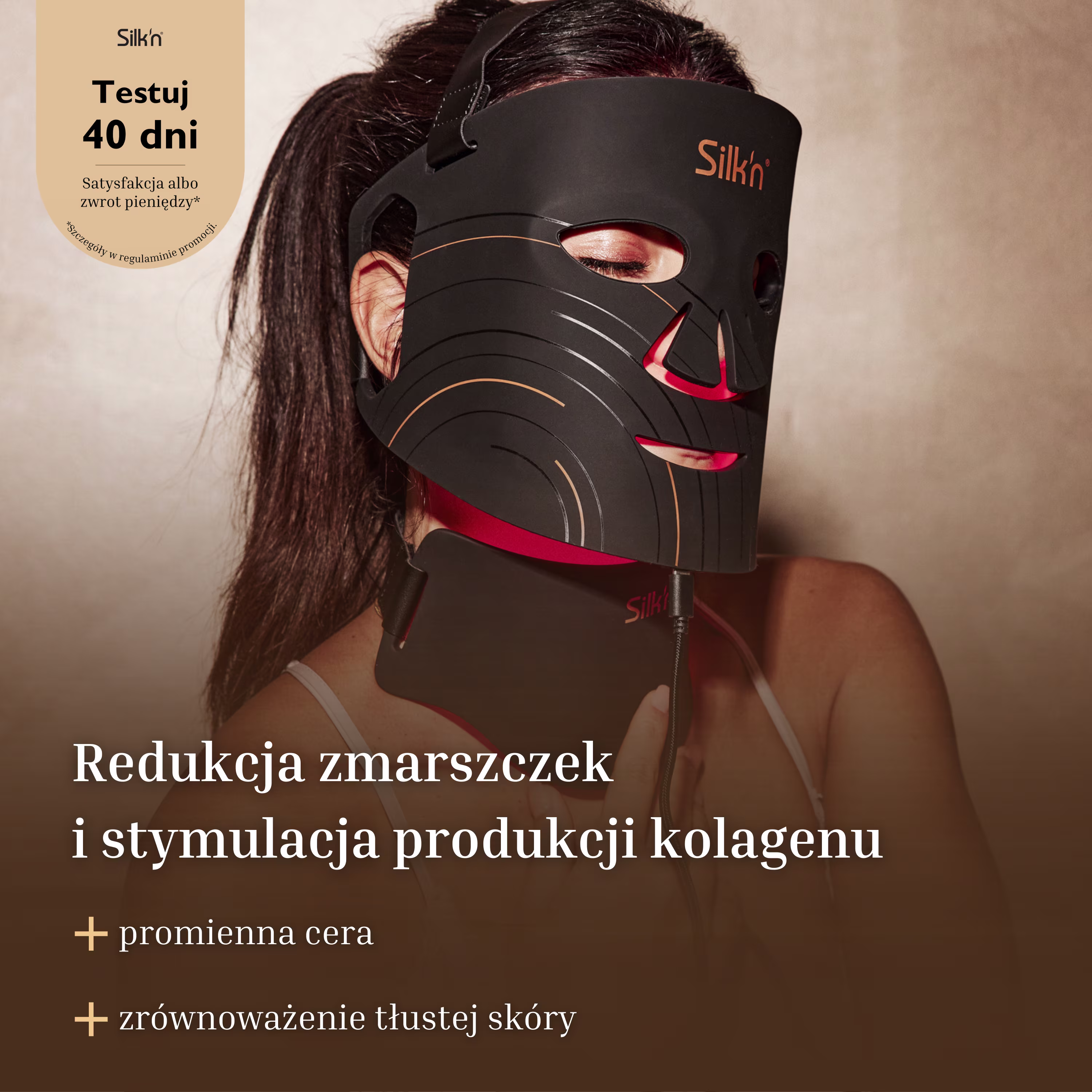 Doświadcz korzyści płynących z potrójnego światła LED: czerwonego, ciemnoczerwonego i bliskiej podczerwieni w celu redukcji zmarszczek, zwiększenia produkcji kolagenu i poprawy tekstury skóry.