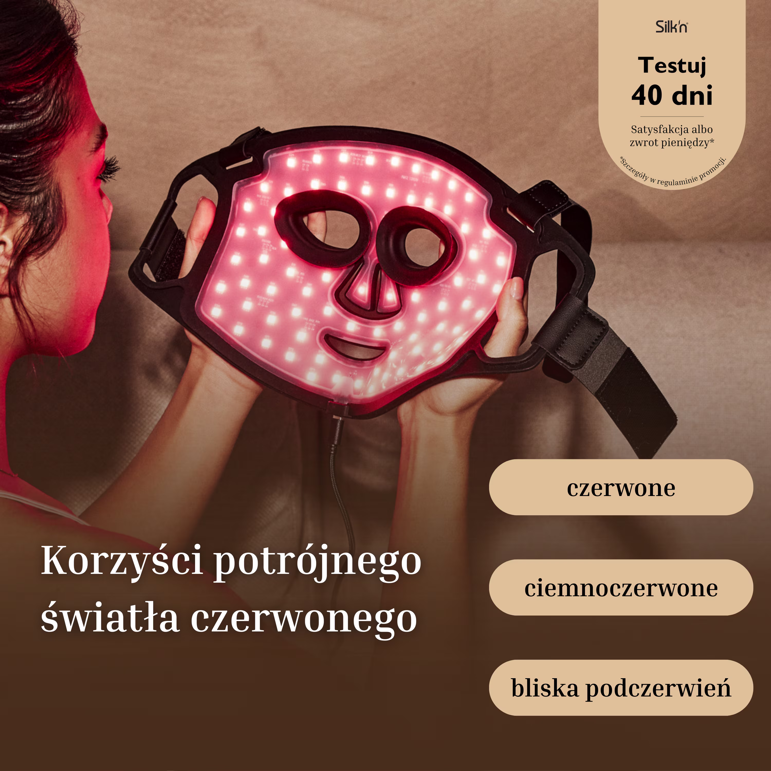 • Tryb 2 – ciemnoczerwone światło LED (660 nm) + bliska podczerwień (830 nm): dla jaśniejszej i gładszej skóry.