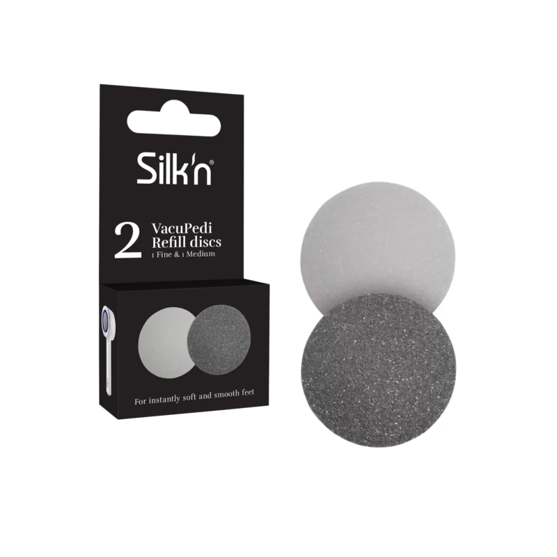 Silk’n VacuPedi wyposażony jest w 3 tarcze do peelingów drobnego, średniego lub grubego, a także 3 wymienne filtry, które wychwytują martwy naskórek.